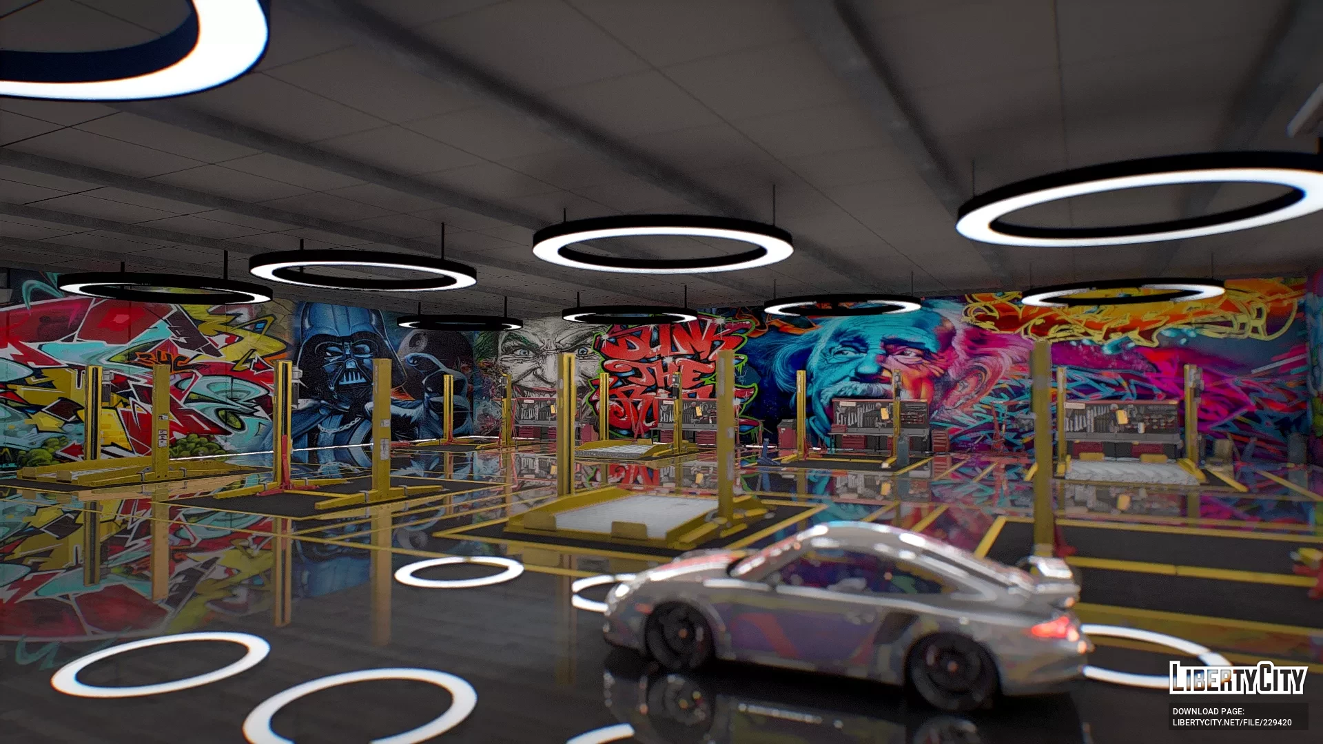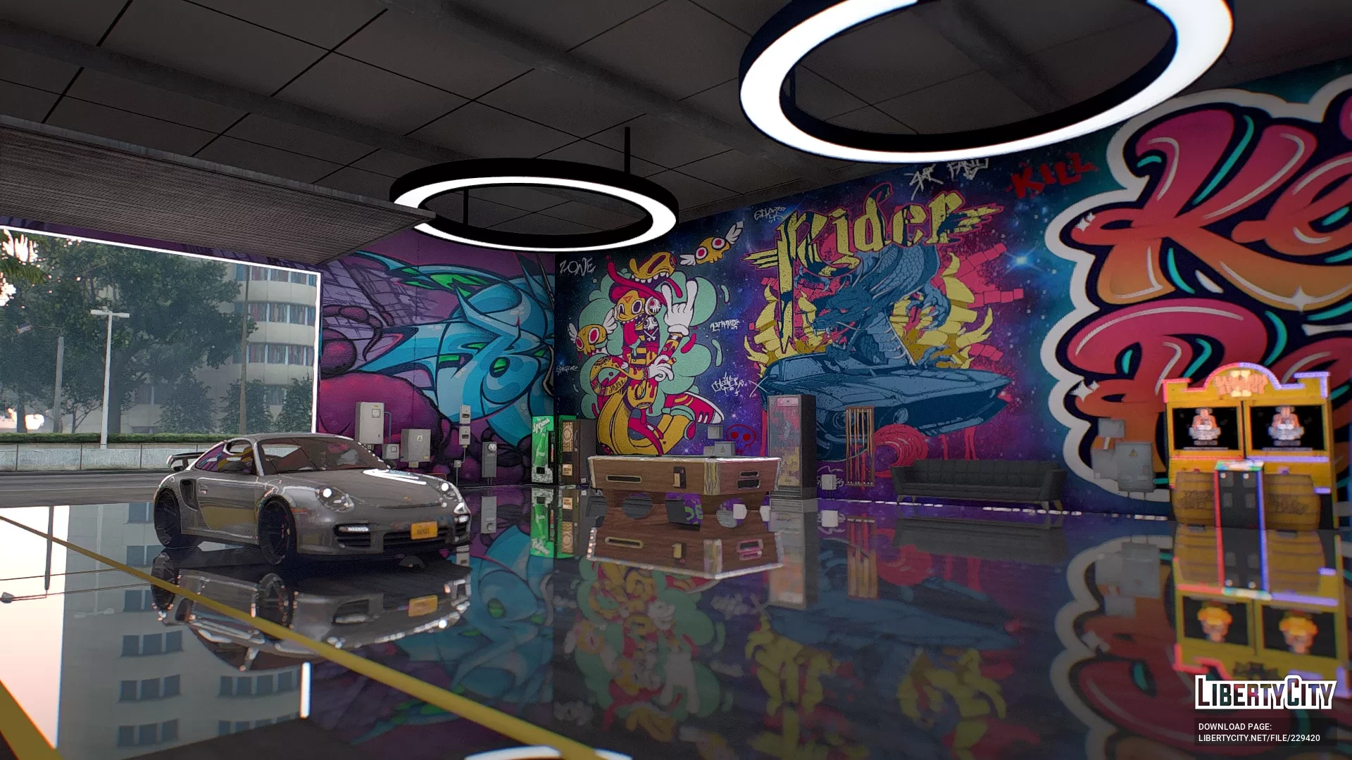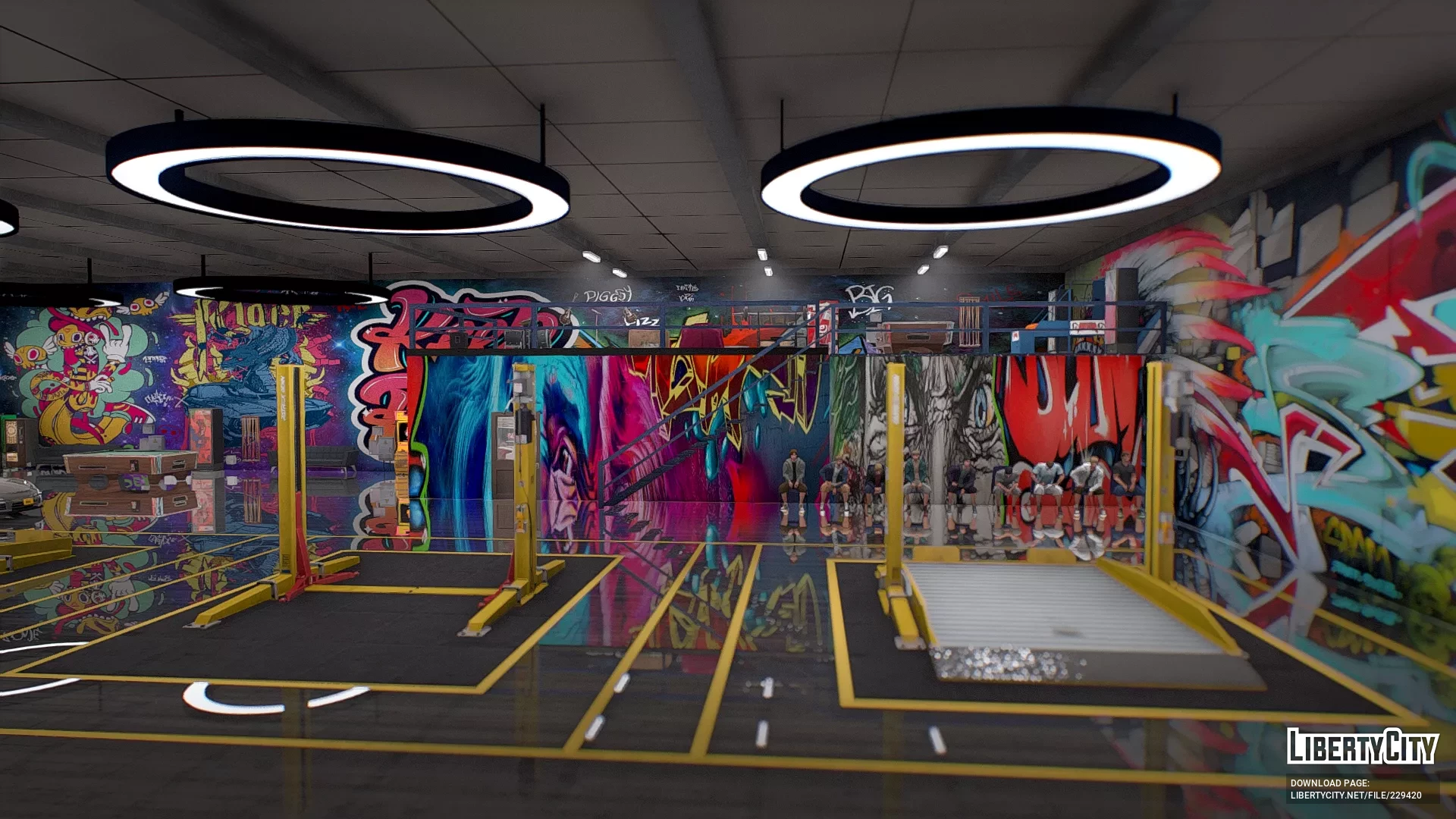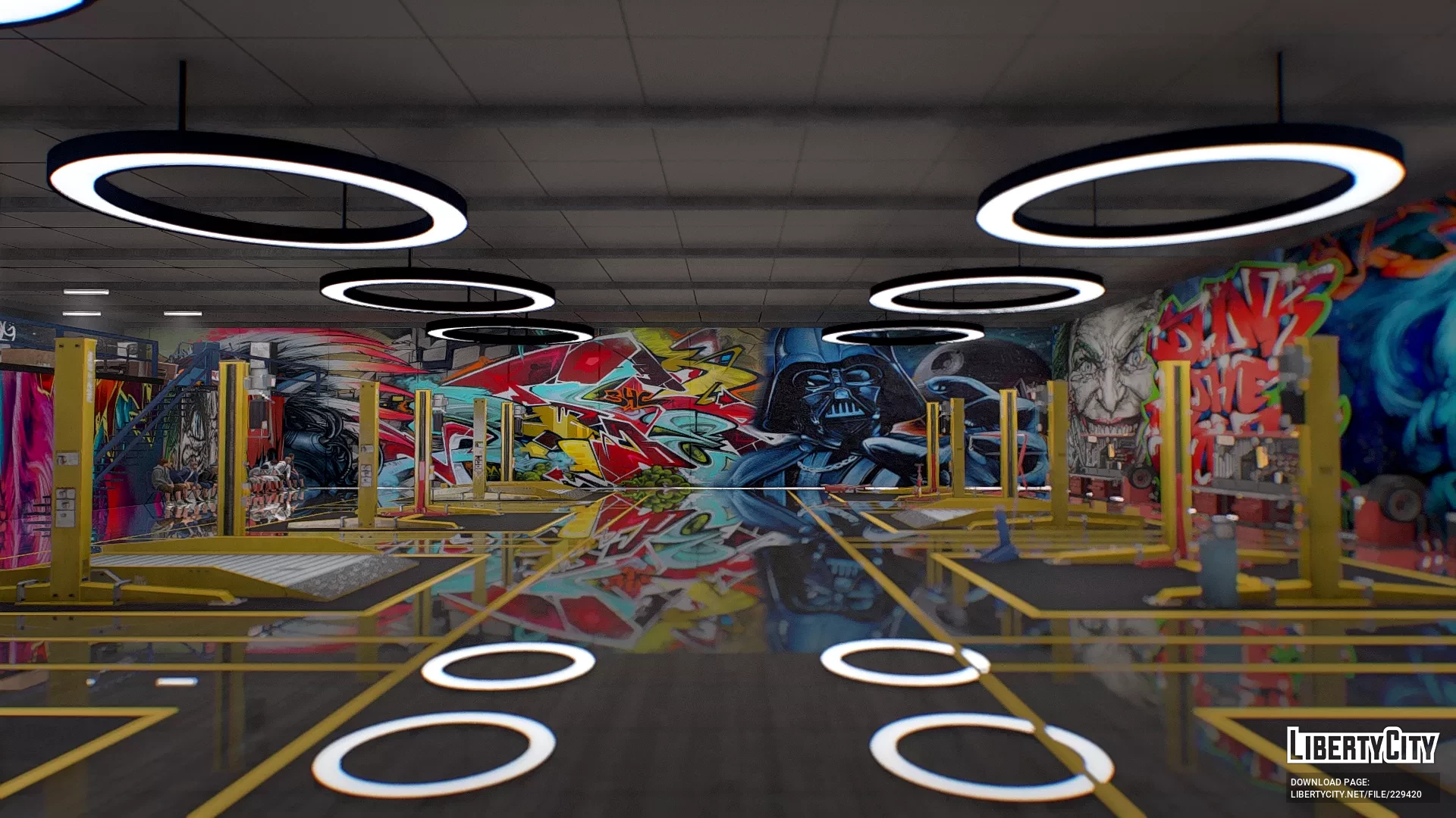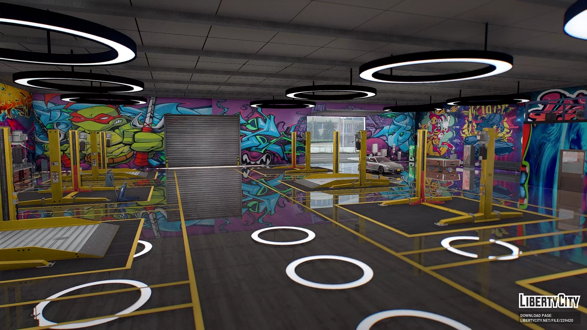 Внешний вид Gindena Mechanic представляет собой большое промышленное здание с серой металлической крышей и кирпичными стенами. Главная особенность фасада — яркое и масштабное граффити, покрывающее всю переднюю стену. На граффити изображены известные персонажи поп-культуры: Черепашка-ниндзя с красной повязкой, Спанч Боб, Патрик, Кот из мультфильмов и другие мультяшные герои. Картина выполнена в насыщенных, контрастных цветах, что делает здание очень заметным и узнаваемым. Контуры здания и дверей выделены белыми светящимися линиями, что добавляет современный и стильный акцент. В целом, внешний вид мастерской выглядит креативно, молодежно и привлекает внимание благодаря своему уникальному оформлению.