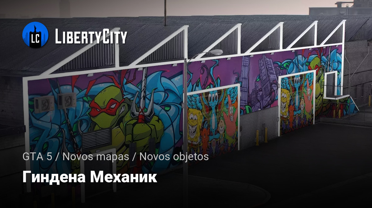A aparência externa do Gindena Mecânico é um grande edifício industrial com telhado metálico cinza e paredes de tijolos. O destaque da fachada é um grafite vibrante e imenso que cobre toda a parede frontal. No grafite, estão personagens famosos da cultura pop: Tartaruga Ninja com faixa vermelha, Bob Esponja, Patrick, o Gato dos desenhos animados e outros heróis animados. A arte é feita com cores intensas e contrastantes, tornando o prédio muito visível e reconhecível. Os contornos do edifício e das portas são destacados por linhas brancas luminosas, adicionando um toque moderno e estiloso. No geral, a aparência da oficina é criativa, jovem e chama atenção por seu design único.
