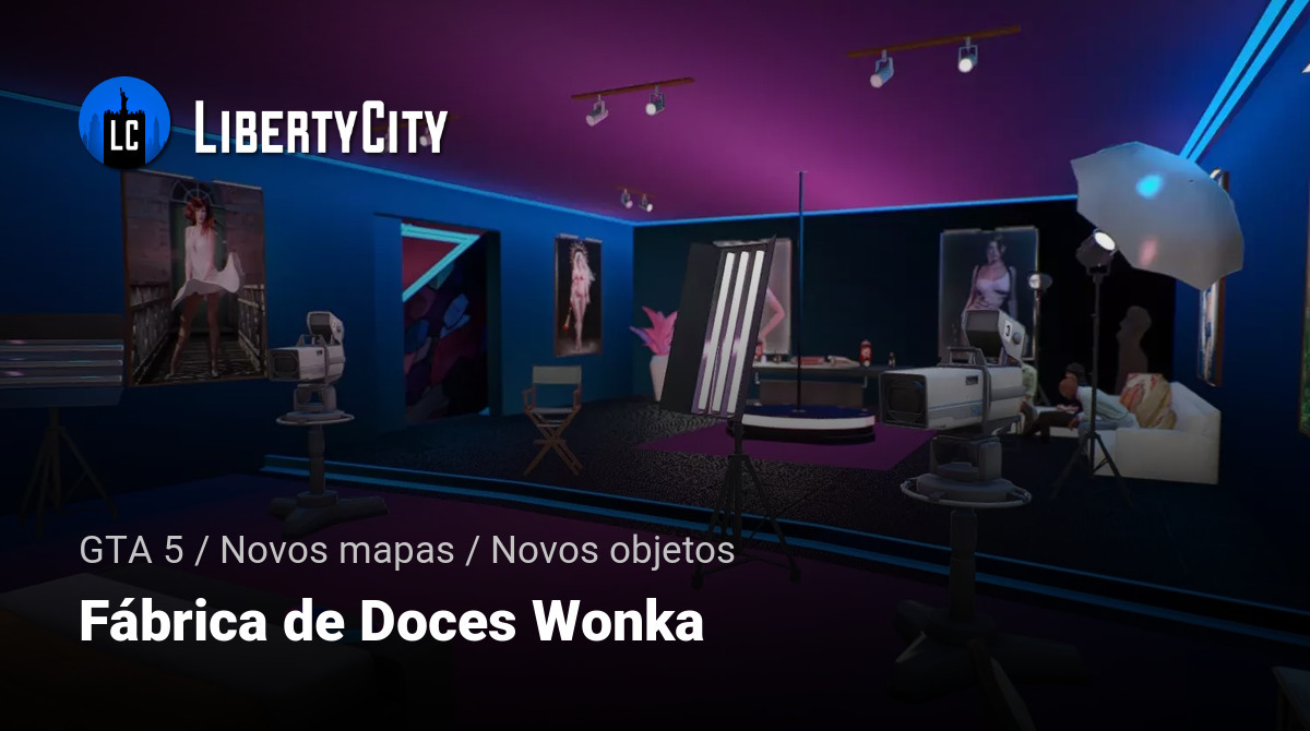O interior da Fábrica de Doces Wonka é vibrante e estiloso. A cor principal das paredes é um roxo intenso, que combina harmoniosamente com linhas azuis neon ao redor do ambiente. No centro da sala, há um balcão com uma vitrine, onde provavelmente são vendidos doces. Na parede atrás do balcão, está o logotipo redondo da "Fábrica de Doces Wonka".