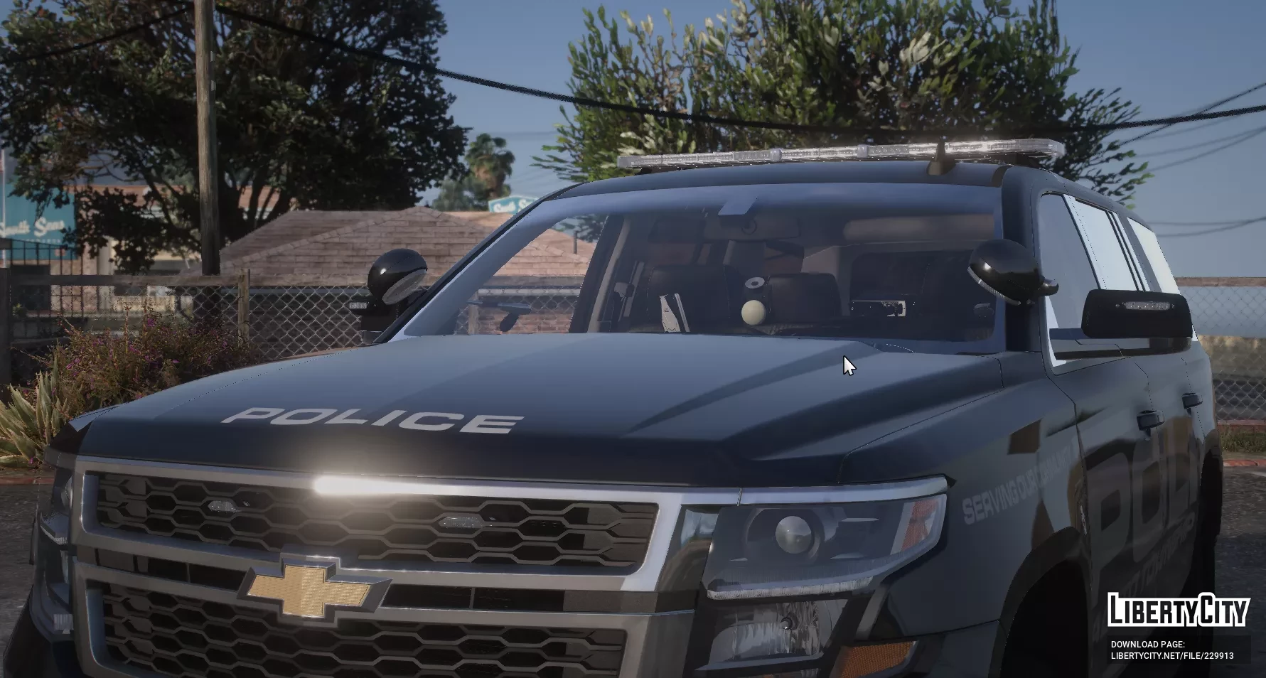 - No capô e nas laterais estão as inscrições "POLICE" e "SERVING OUR COMMUNITY", ressaltando a função policial do veículo.