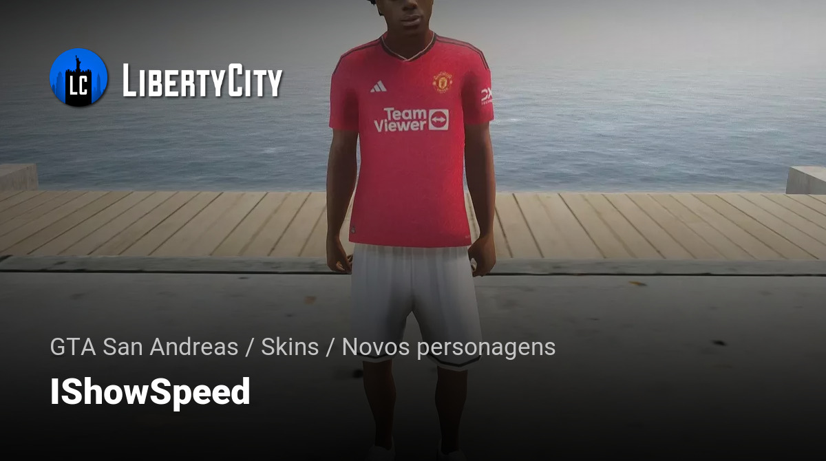 IShowSpeed está vestido com uma camisa de futebol vermelha com o logotipo do Manchester United e o número 7, além do apelido "ISHOWSPEED" nas costas. Ele usa shorts esportivos brancos com detalhes pretos e tênis brancos. Seu cabelo é curto e escuro com dreads. A aparência transmite perfeitamente a imagem de um fã de futebol e streamer, pronto para novas conquistas esportivas.