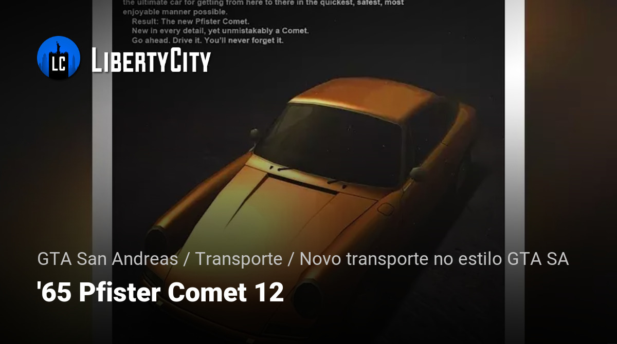 Este é um automóvel amigável ao lore com um design original do jogo. O modelo é inspirado no lendário Porsche 912 (1965) e representa um clássico cupê esportivo, perfeitamente alinhado com a estética de San Andreas. O carro é detalhado, possui texturas de alta qualidade e está totalmente de acordo com o estilo canônico de transporte de GTA San Andreas.